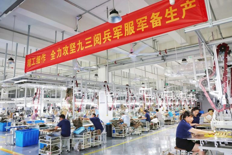 “全厂动员、全员关注、全体参与”已成为阅兵保障生产现场的生动写照,职能部门、车间管辅、修机组辅助人员齐上一线,与基层员工并肩作战;全体员工以“时不我待”的紧迫感抢时间、赶进度,战高温、斗酷暑,在流水线上默默坚守。有的人员主动递交请战书,支援生产一线;有的班组自愿立下军令状,坚决完成生产任务;有的职工带病坚持工作,主动增产……,广大干部职工以完成阅兵保障任务为荣,从裁剪的精准无误,到缝纫的细致入微,再到包装发运的严谨有序,50多个日夜的连续奋战终见成效,所有产品按期高质量交付,获得了部队领导和官兵的赞扬。