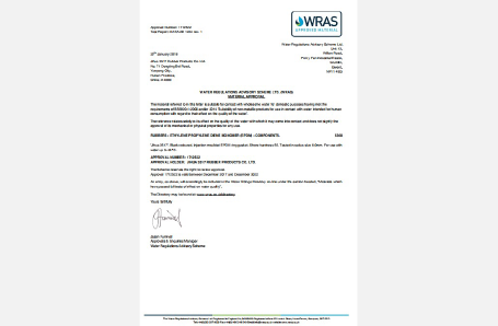2007年11月,研制的直饮水胶圈通过英国(WRAS)论证,是国内首家通过该认证的企业。2013年、2018年分别复审通过该项认证。