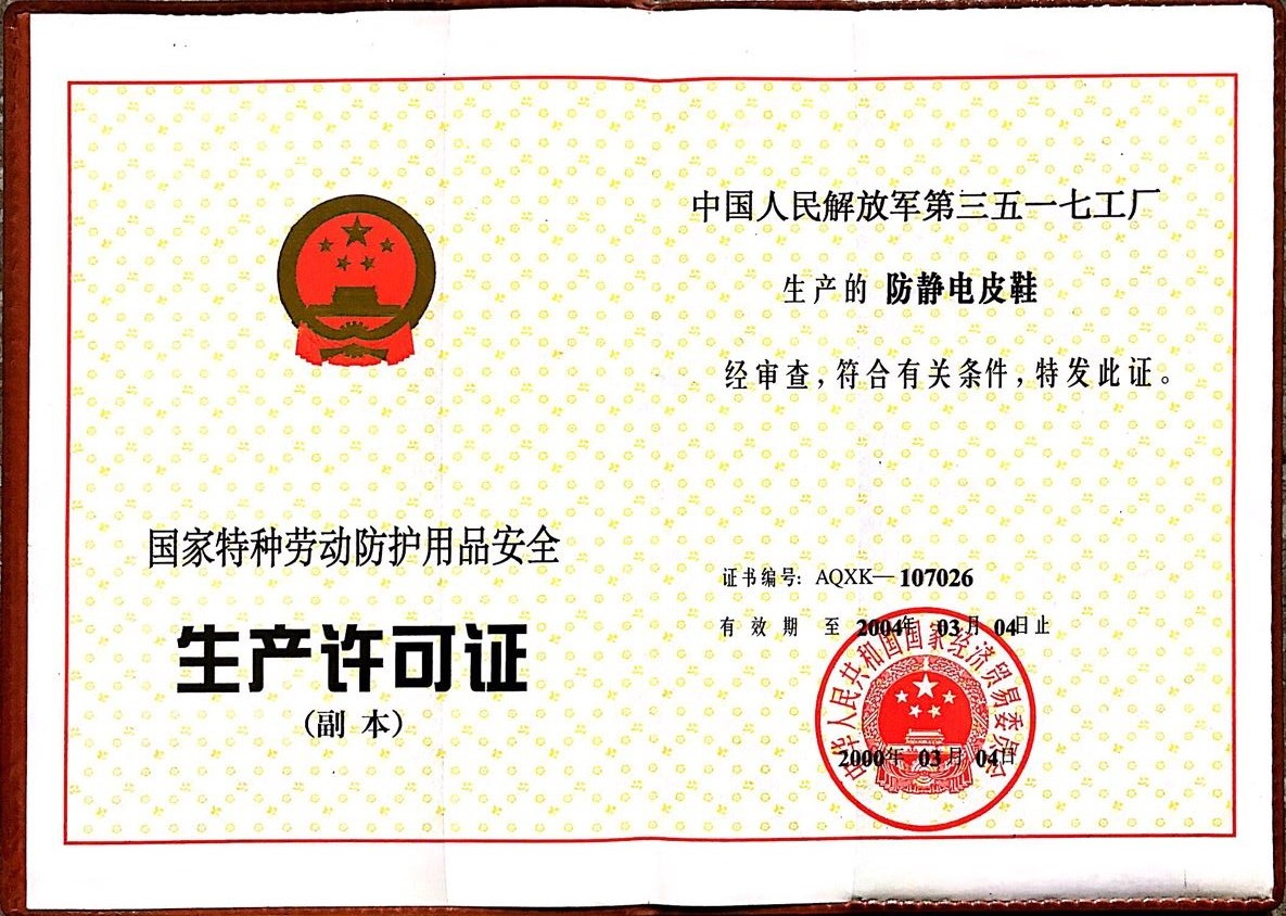 2000年 防静电皮鞋 生产许可证