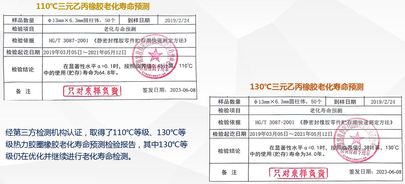 二是按静密封橡胶零件贮存期快速测定方法(HG/T 3087-2001)标准要求,取得了热力胶圈橡胶老化寿命预测的第三方检验认证,110℃等级64.8年,130℃等级34.0年,130℃等级仍在优化并继续进行老化寿命检测。