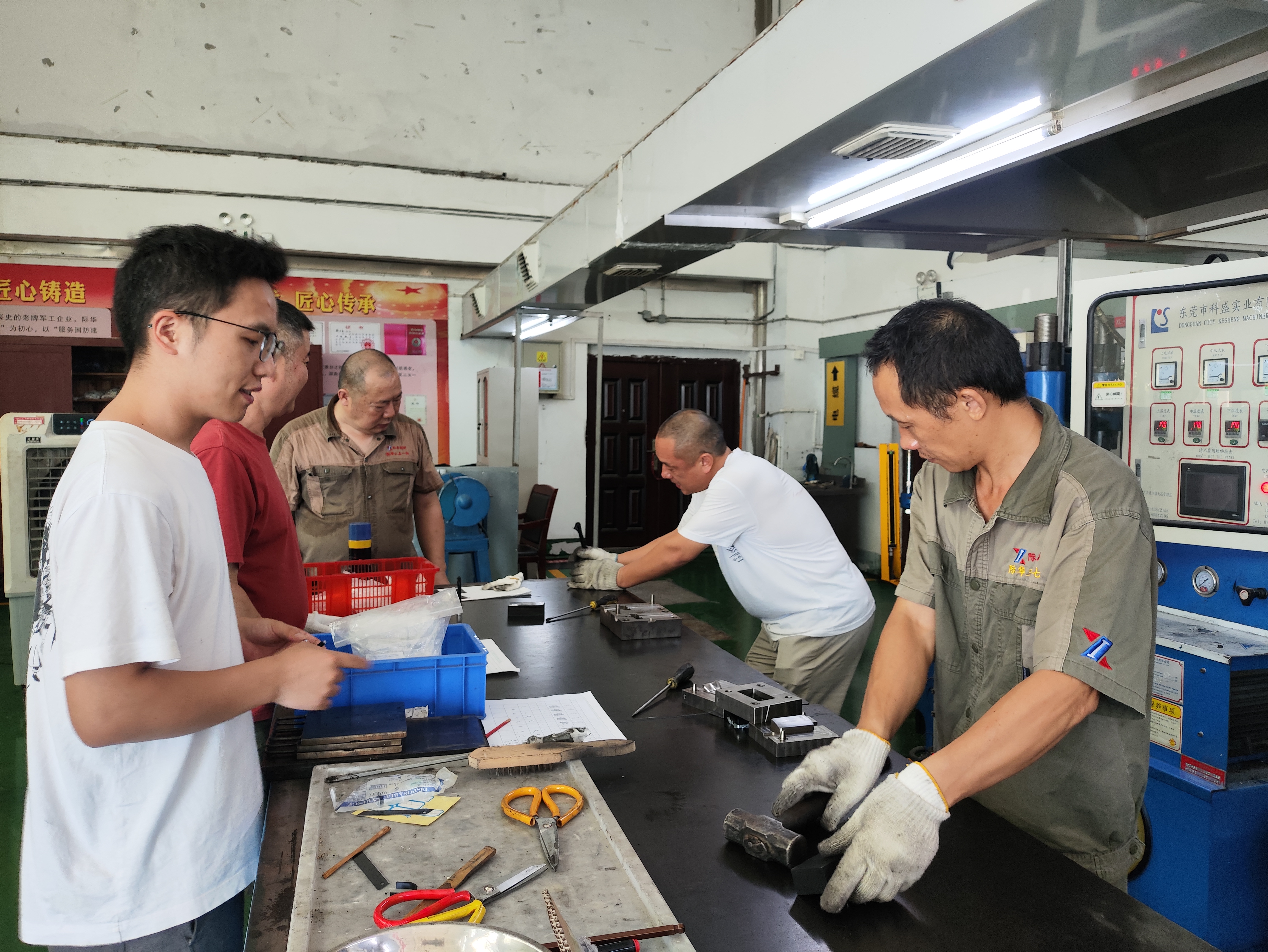 为确保订单按时保质保量交货,技术研发部攻坚克难。一是主动积极协调各方(包括9634公司和铝件供应方及模具加工方),不等不靠,不推卸责任,把9634公司的事当自己的事,把应由9634公司出面协调的模具设计加工和铝件供应两项工作主动揽过来,每天跟踪、调整进度;利用9634公司原有两副旧模具,模具完成一副使用一副;铝件跟随模具前后分8批供应,保证模具到、铝件到,有力推进进度。二是确保包胶质量。为解决包胶不粘、水口胶迹等质量问题,多次试验,积极摸索工艺,最终确定定型使用开姆洛克胶水和美纹纸并形成工艺。从刷胶到炼胶硫化,操作工自己检查自己把关,首件包胶成品送9634公司确认一次性通过。三是技术研发部全员发动,从领导、研发人员到小工场员工,既是指挥员又是战斗员,既是技术员也是操作工。四是加班加点赶任务。技术人员刘永红、聂旺和小工场员工李艳辉、熊建军、梁箫连续上班14天,包括四个晚班一个白晚连班,克服高温炎热天气,在不耽误正常快检、材料检测等正常工作情况下,完成每天的刷胶硫化清点任务,大家没有一句怨言。