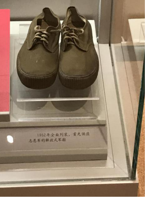 2020年10月29日,际华三五一七橡胶制品有限公司将1951年制作的第一批解放式军鞋样品,捐赠给了中国人民革命军事博物馆收藏。这双保存了近70年的解放鞋,终于拥有了一个特别的归宿,它静静地陈列在军博的展示柜里,围条上的胶色早已斑驳,军绿的光芒却不曾褪色,中底布上工整的手写体记录着“抗美援朝 70周年纪念”,它沉甸甸的,一种厚重感让人拿起就不敢轻易放下,仿佛一名坚毅的战士,随时准备好出征凯旋,却又像极了一位历经风霜的年迈老人,诉说着岁月的不易和历史的沧桑。